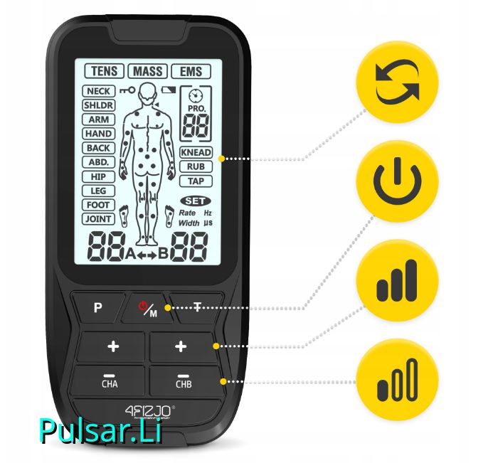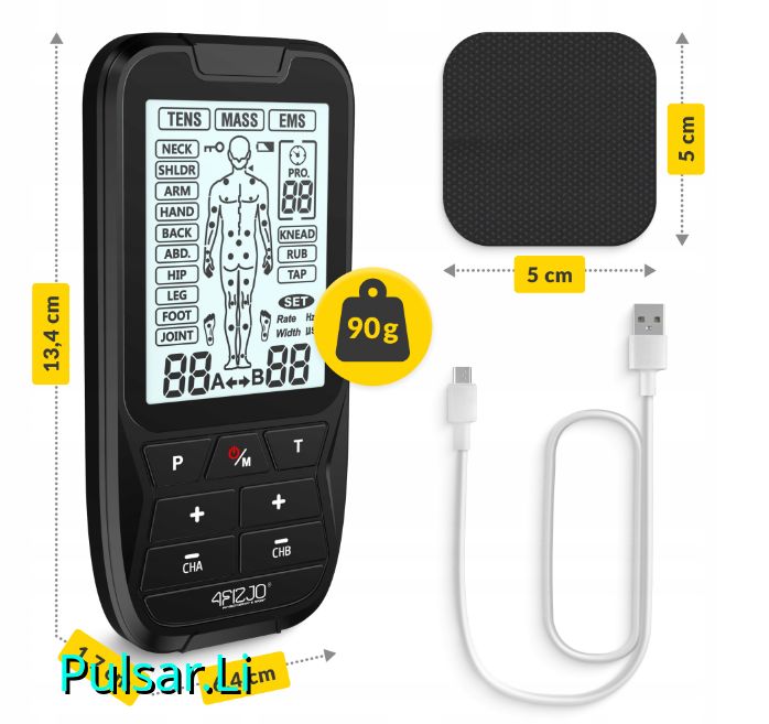 - Modi: 3 (TENS, EMS, MASS – Massage)